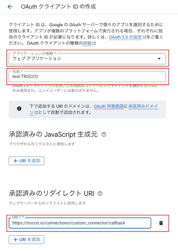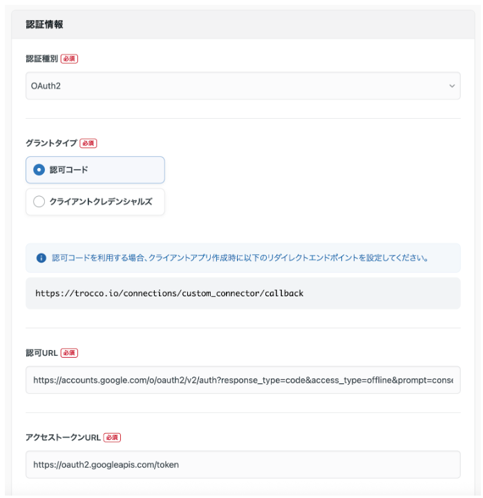 - 承認済みのリダイレクトURI:https://trocco.io/connections/custom_connector/callback