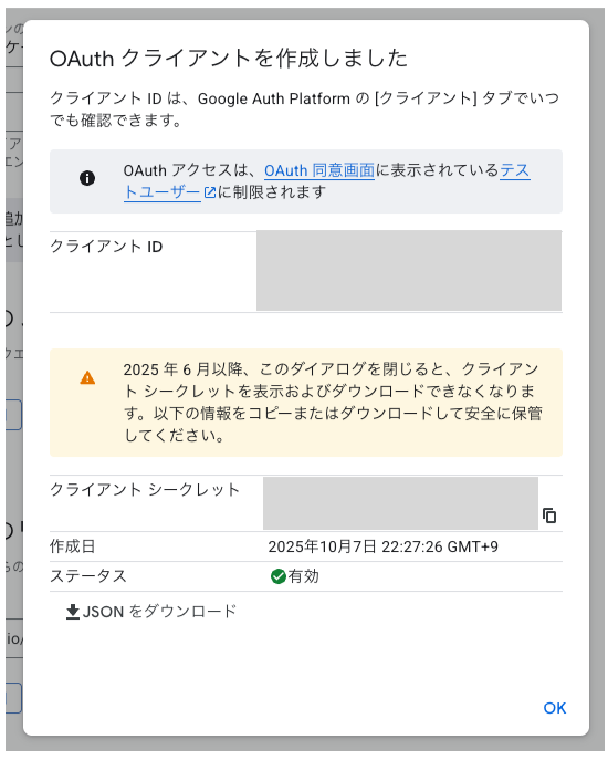 クライアントIDとシークレットが表示されるため、控えておきましょう。