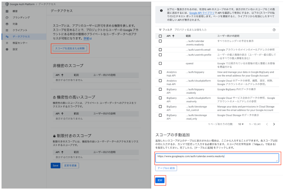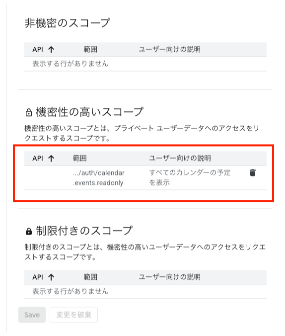 今回はカレンダーイベント(予定)を読むことができれば事足りるので、event.readonlyを使用します。Google Calendar APIで利用可能なスコープの一覧はこちらのドキュメントで確認できます。