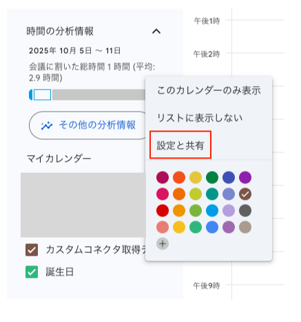 まずはGoogle Calendarにアクセスし、対象カレンダーの「設定と共有」を開きます。