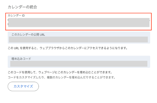 設定項目の中に「カレンダーの統合」というセクションがあり、この中に「カレンダーID」が表示されています。