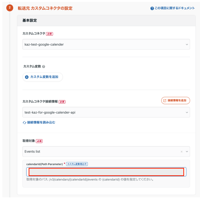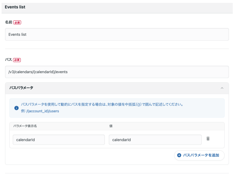 カレンダーIDをパスに含める必要があるため、STEP2で取得しているカレンダーIDを記入します。