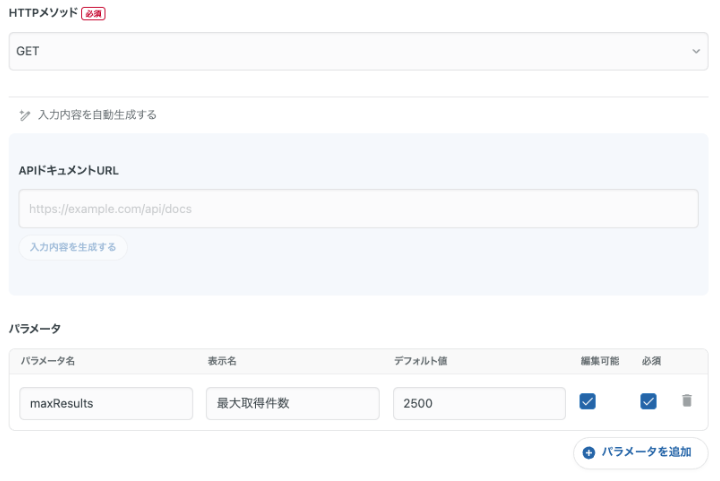 - 表示名:最大取得件数(任意の名前で可)