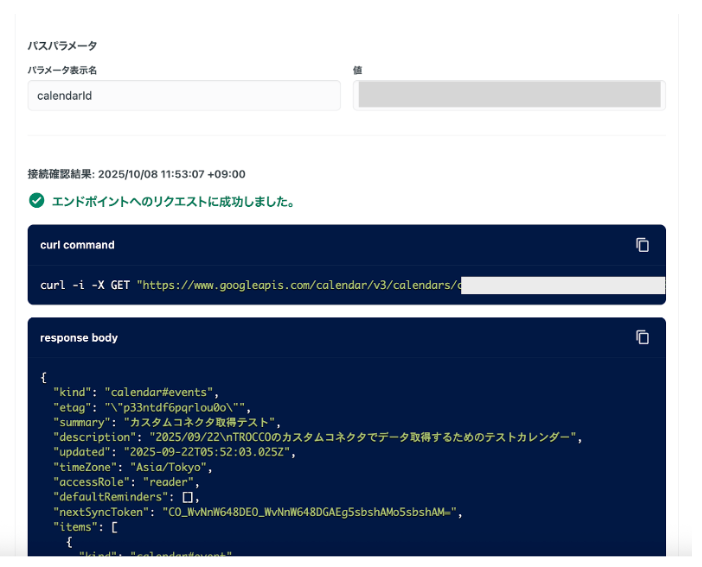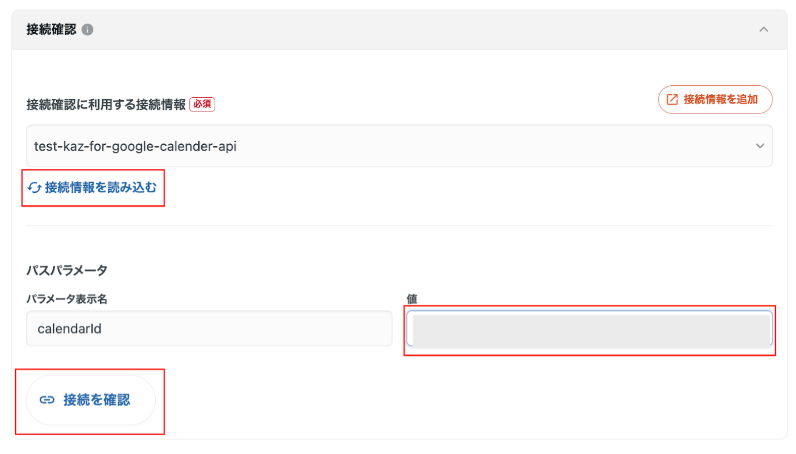 パスパラメータにはSTEP2で取得した対象のカレンダーIDを入力し、「接続を確認」をクリックします。
