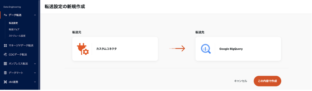 メニューの「データ転送→転送設定→転送設定の新規作成」と進み、転送元にカスタムコネクタ、転送先にDWH(今回はBigQuery)を設定します。