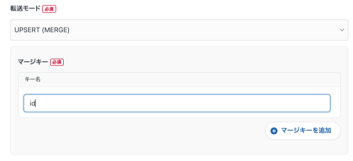 今回の例では、その時点でどのリリースがあったのかを正確に記録したいため、BigQuery側の設定では転送モードを「UPSERT(MERGE)」として指定します。