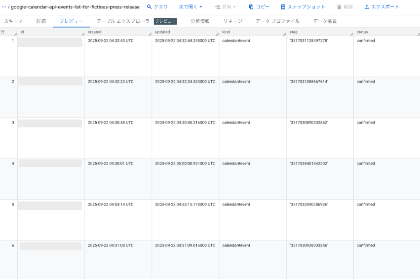 BigQueryにテーブルが作られ、データが閲覧できれば接続成功です。