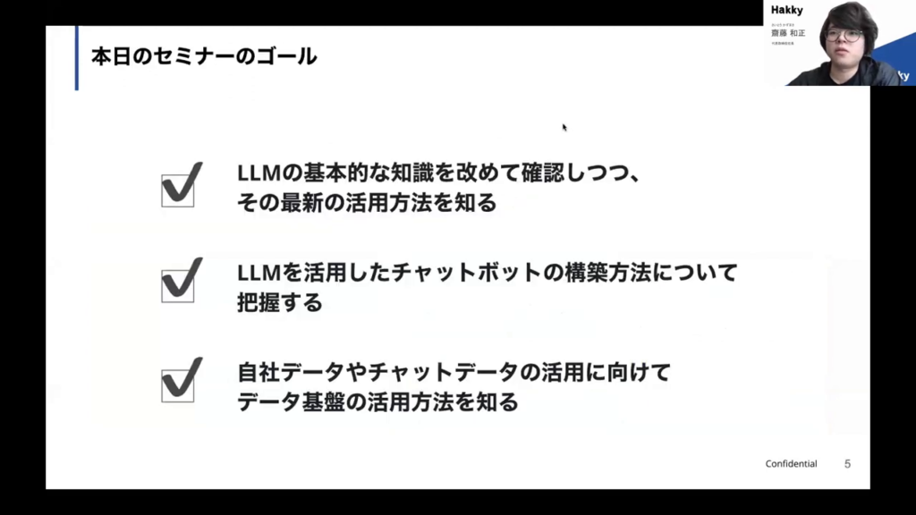 本セミナーでは、LLMを最大限活用するデータ分析基盤の重要性、チャットボットの可能性、LLMをビジネスに活用し自社のデータを最大限に活かす方法などを詳しく解説しました。