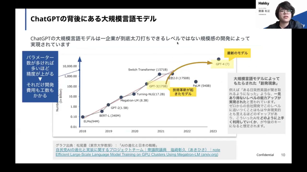 齋藤氏:「ChatGPTの背後にあるのは、私たちのような一般的な企業が対抗できるレベルを超えた大規模な言語モデルです。