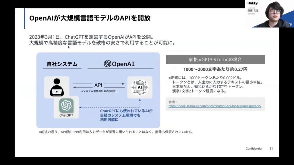 齋藤氏:「OpenAIが大規模言語モデルのAPIを2023年3月1日に公開しました。APIにより、高精度な言語モデルを非常に低価格で利用できるようになりました。
