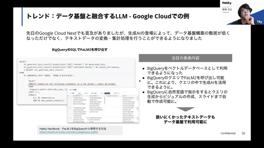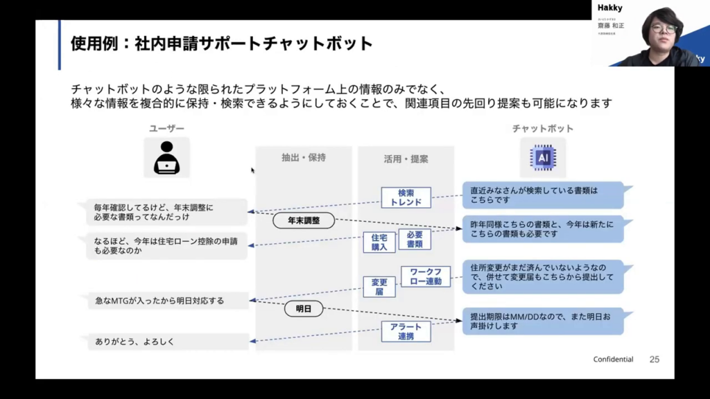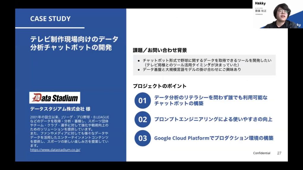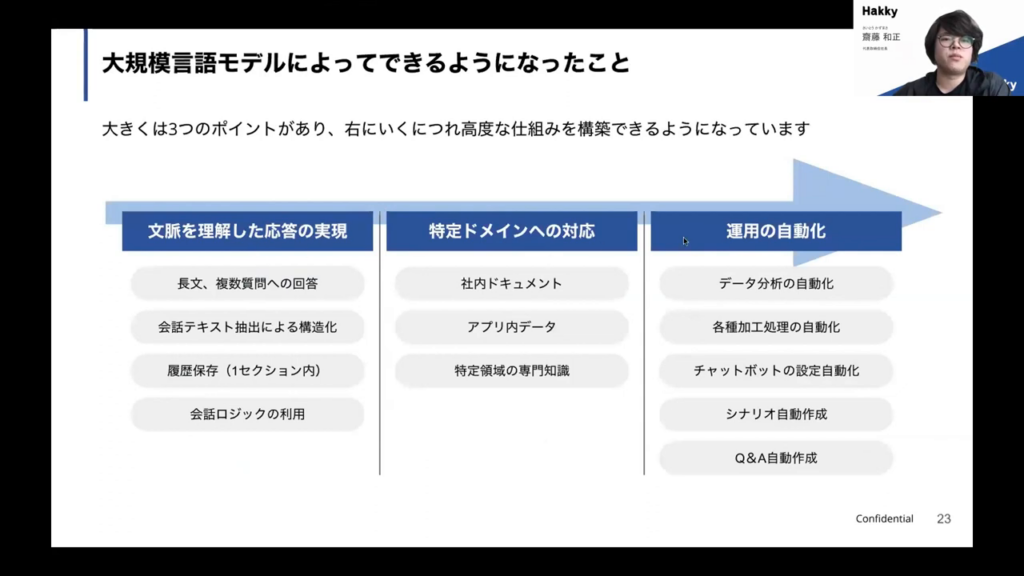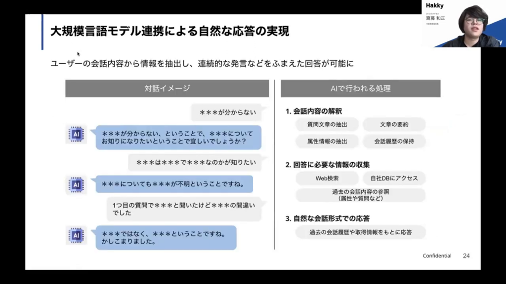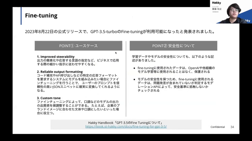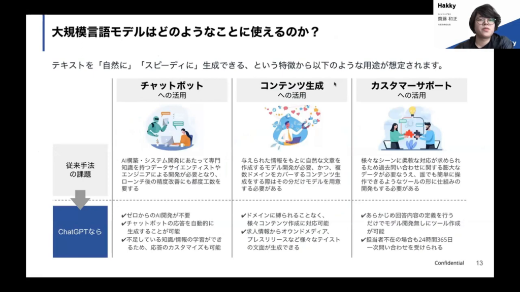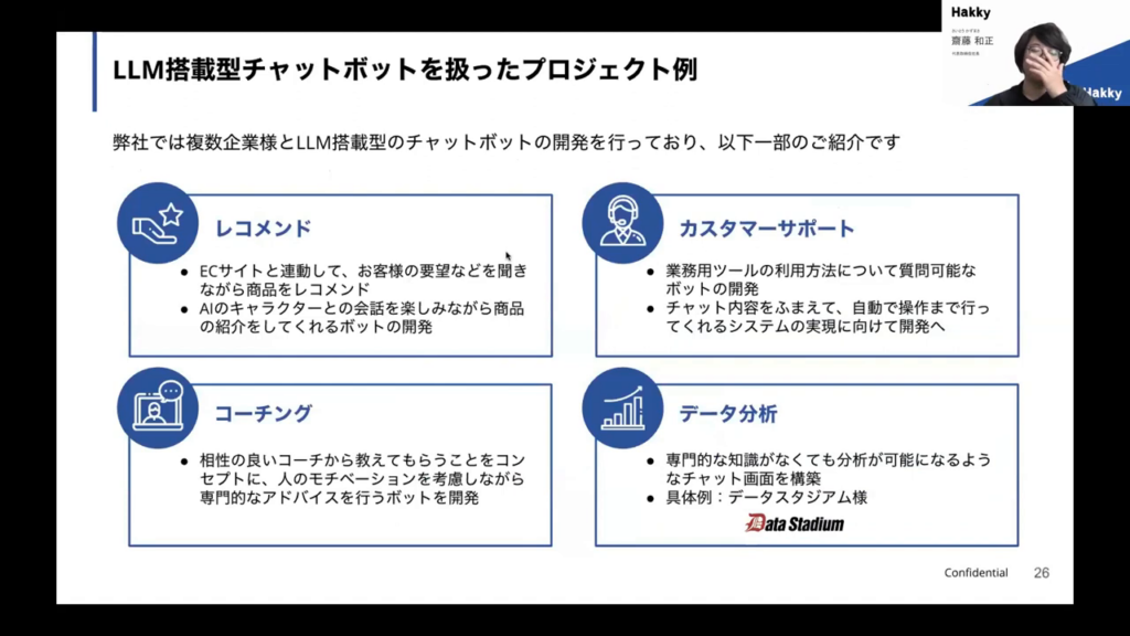 齋藤氏:「Hakkyでは、大規模言語モデルを業務やプロダクトに活用したいと考えている企業の方向けに、専門的なコンサルティングや開発のサポートを提供しています。