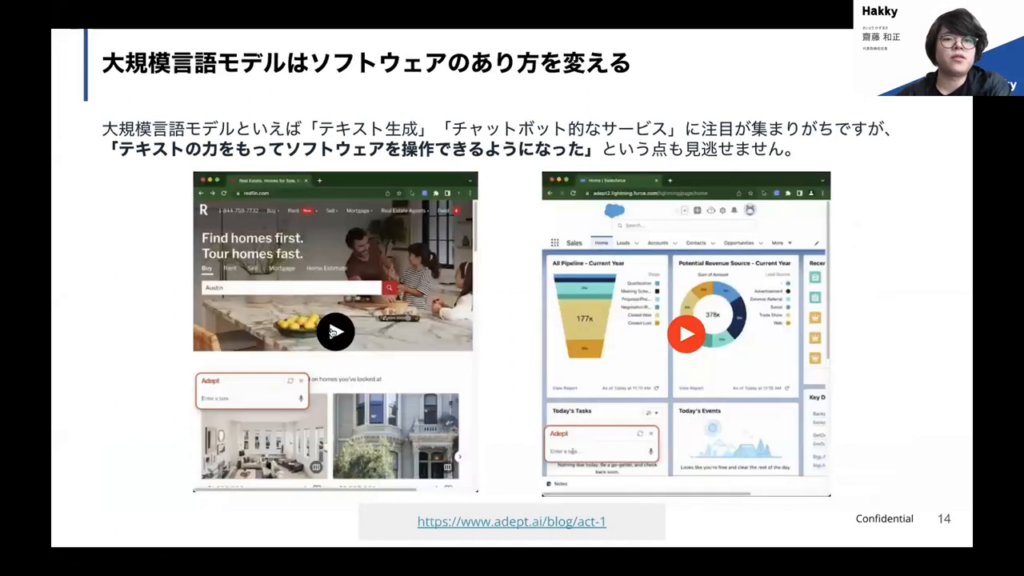 齋藤氏:「大規模言語モデル(LLM)を用いることで、ソフトウェアの運用が大きく変わりました。最も注目すべき点は「テキストだけでソフトウェアを操作できる」という事です。
