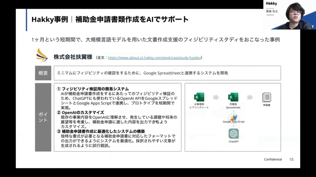 私たちの会社Hakkyは、AIを活用して補助金申請書類作成の支援を行っています。我々はたった1ヶ月という短期間で、大規模言語モデルを用いた文書作成支援のフィジビリティスタディを行いました。