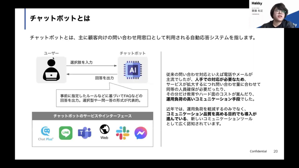 齋藤氏:「第二部では、LLMを活用したチャットボットでできることを解説します。チャットボットは多様な用途で使うことができます。