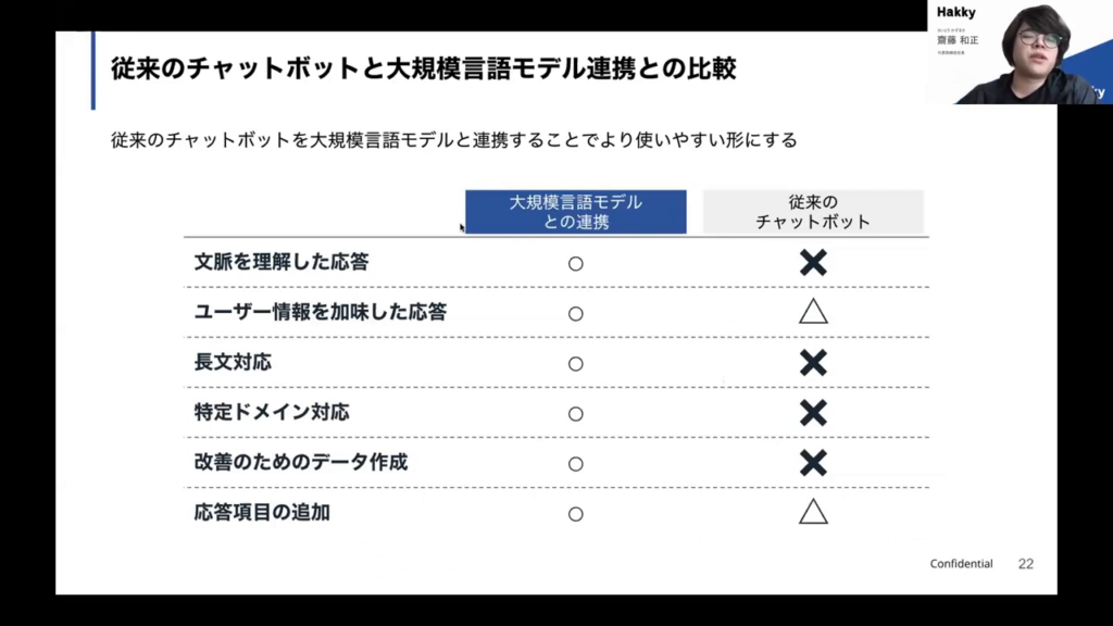 齋藤氏:「従来のチャットボットに大規模言語モデルを組み合わせることで、よりユーザーフレンドリーかつ柔軟な対応が可能になると考えています。