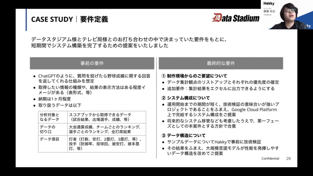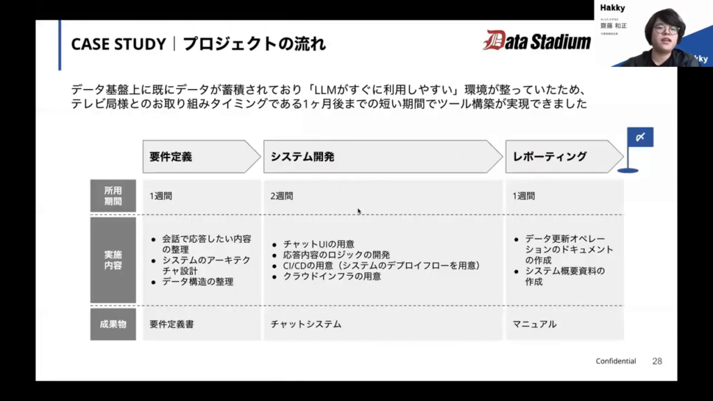 データスタジアム様は長年にわたり収集したデータを用いて情報の提供や分析のサポートを行っているのですが、テレビ制作現場でのデータ分析がチャットを通じて行えるシステムの開発が今回のプロジェクトの目的でした。