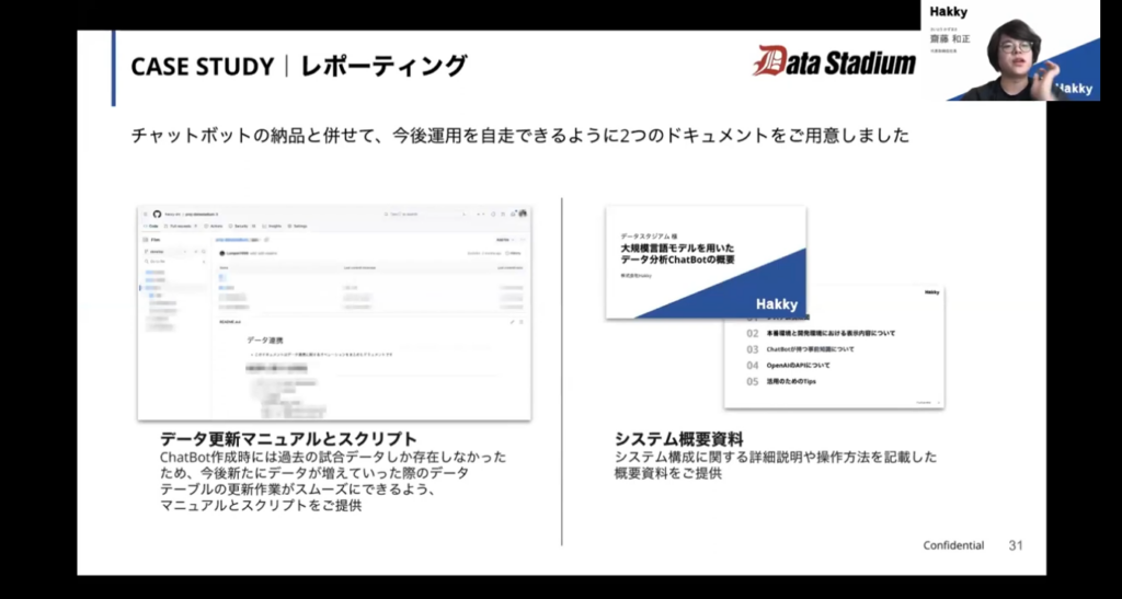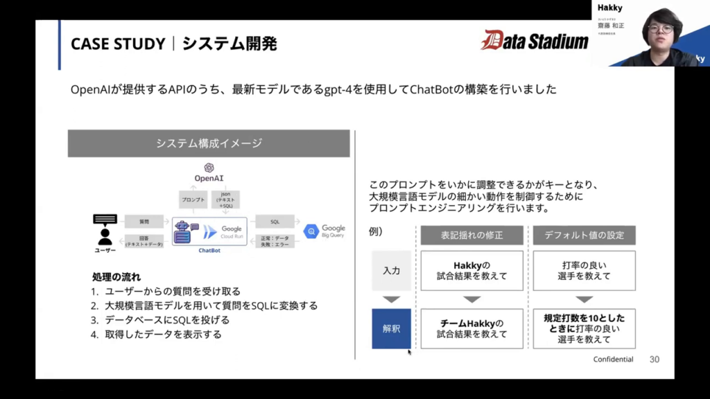 私たちはデータスタジアム様の膨大なデータと大規模言語モデルを組み合わせて、データをチャットボット形式で取得するツールの開発を行いました。」
