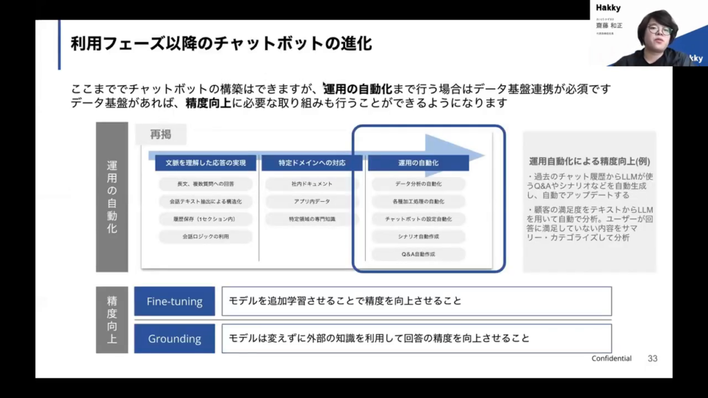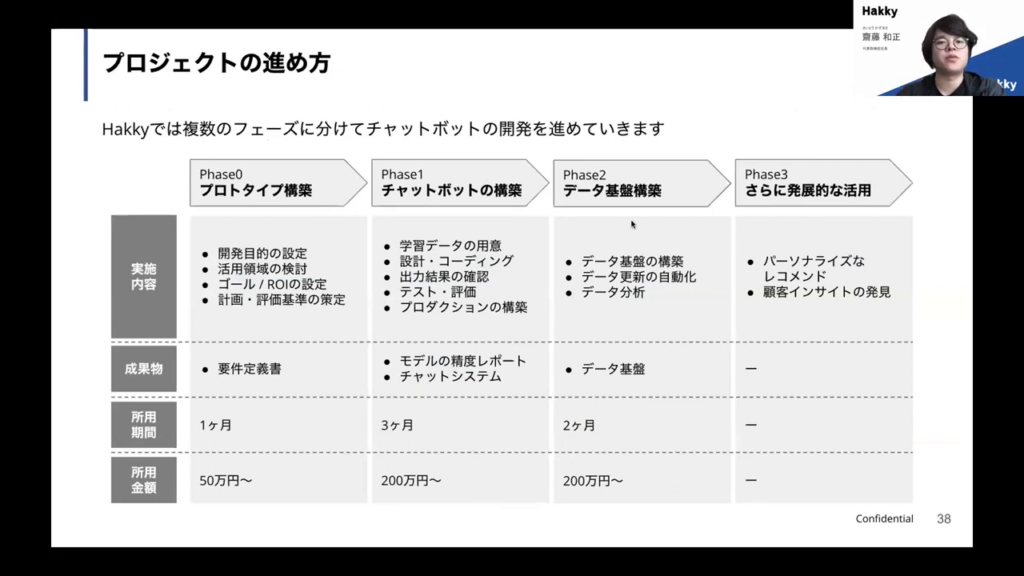 齋藤氏:「Hakkyではチャットボットの開発に関して、複数のフェーズに分けて取り組んでいます。