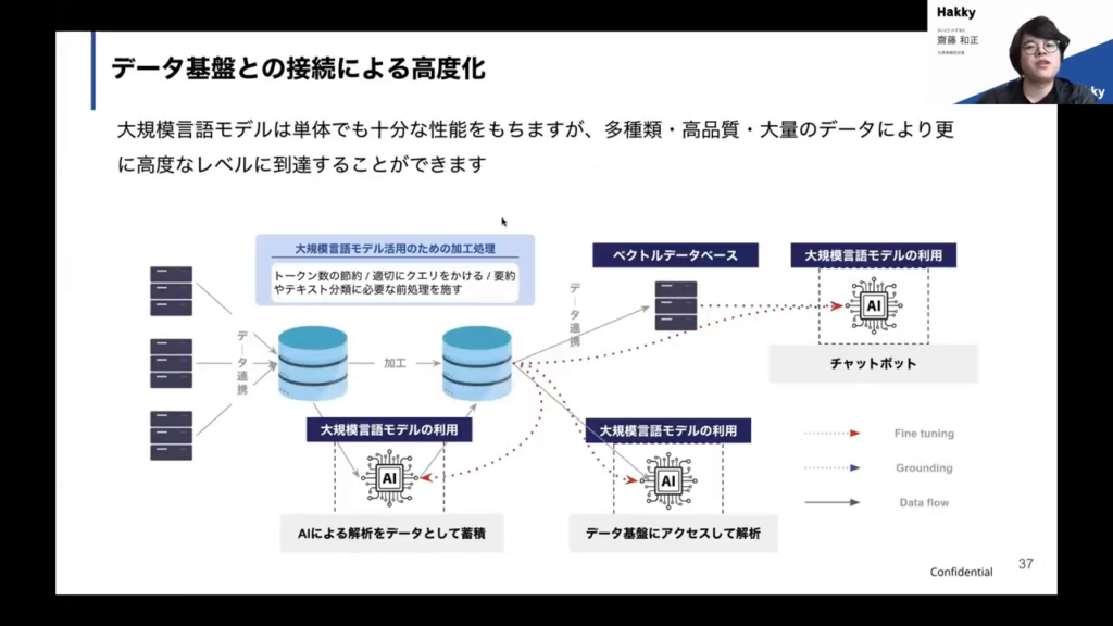 これらのデータはLLMのファインチューニングに役立つだけでなく、新たな知識として利用できます。データ基盤とLLMを連携させることで、LLMの可能性を最大限に引き出すことができると考えています。」