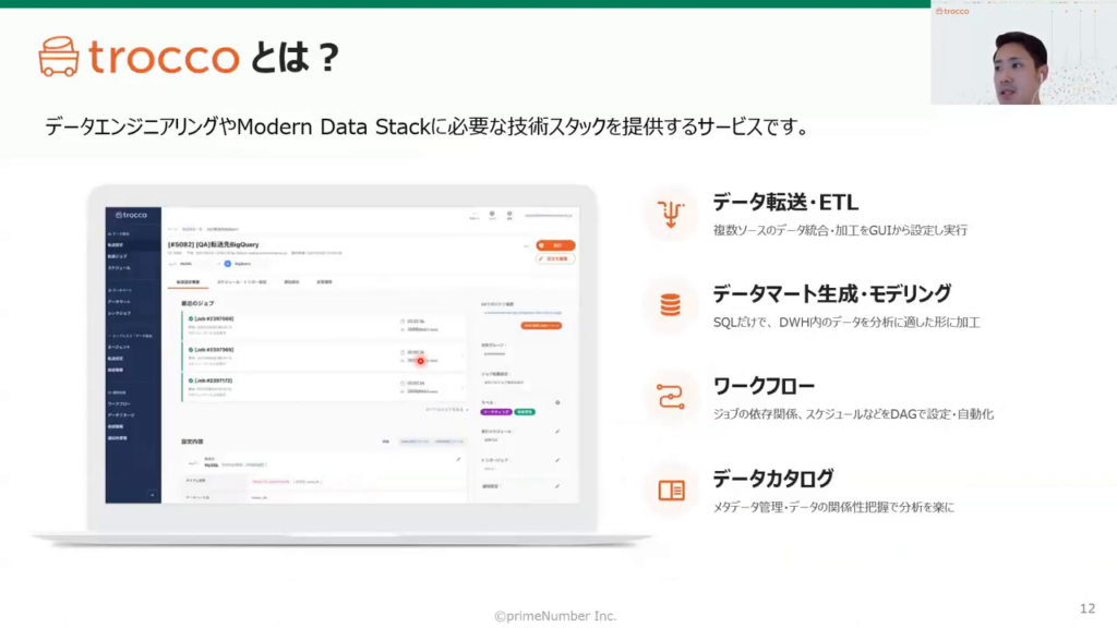 薬丸:「TROCCO®とは、データエンジニアリングやModern Data Stackを構築するために必要な技術スタックを提供するサービスです。