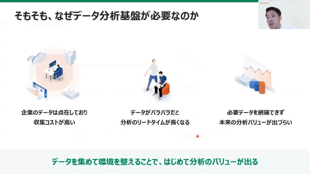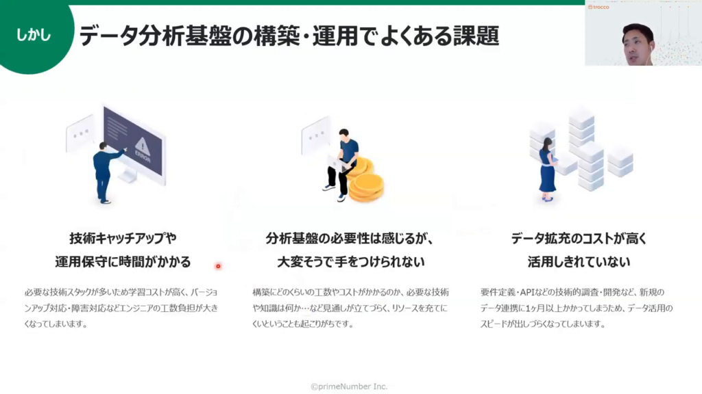 データ分析基盤の必要性は認識していても、どこから手をつけて良いのかがわからないという問題もあります。データを拡充するためのコストが高くて、プロジェクトが前に進まず停滞することもあります。