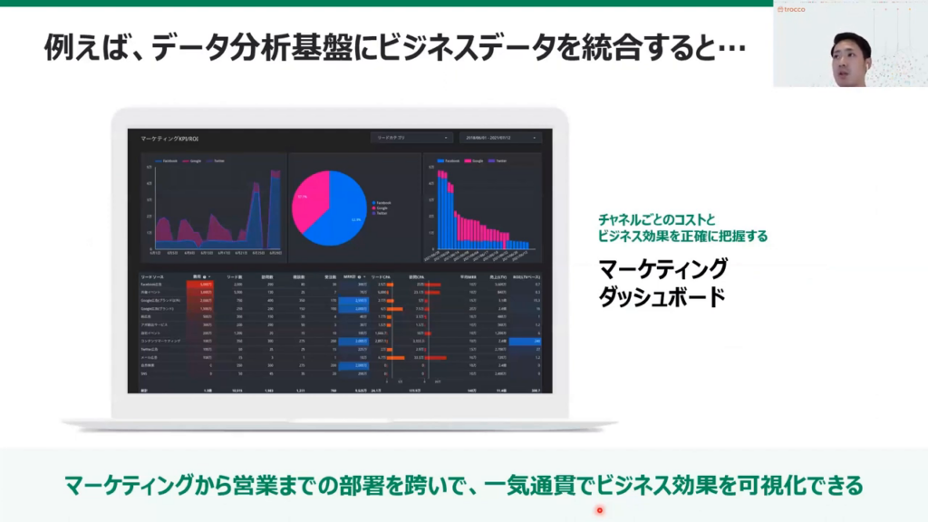 薬丸:「たとえば、データ分析基盤にビジネスデータを統合すると、チャネルごとのコストとビジネス効果を正確に把握できます。