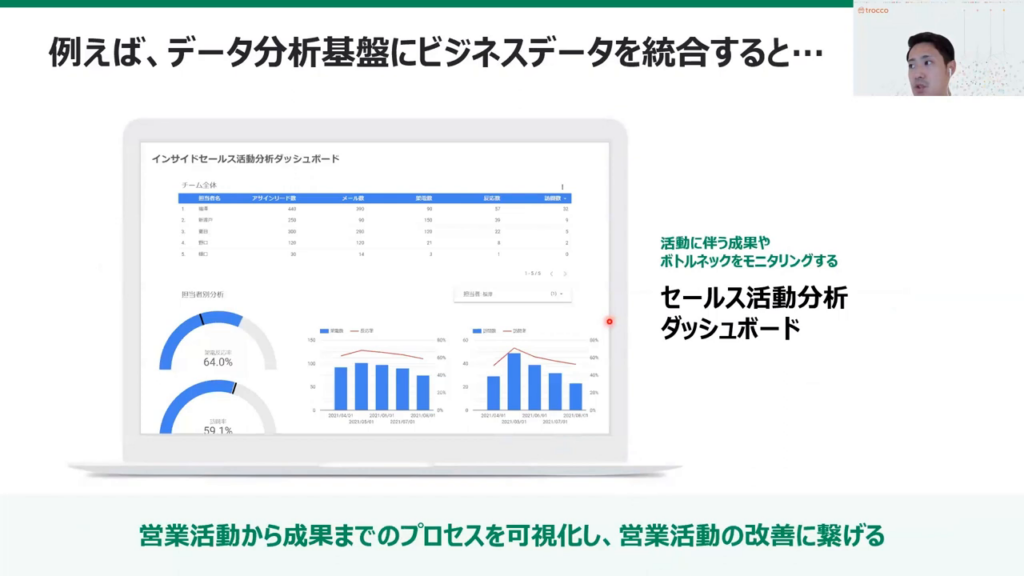 薬丸:「例えば、データ分析基盤にビジネスデータを統合すると、インサイドセールスの活動分析ダッシュボードが作成可能になります。