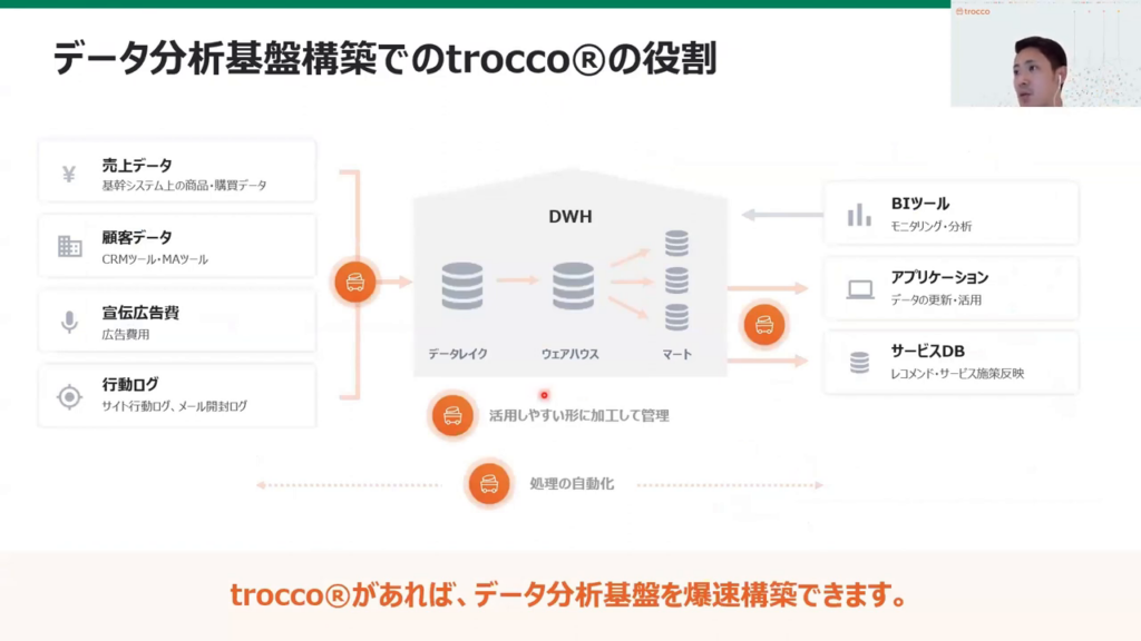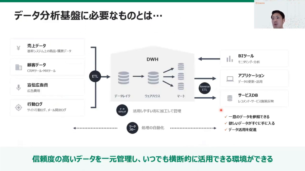 薬丸:「データ分析基盤構築でのTROCCO®の役割とは、売上データや顧客データ、商品データ、広告データなどを一元的に管理し、分析可能な形に加工することです。データウェアハウスやデータレイク、各種アプリケーションと連携して、データの活用を最大化できます。