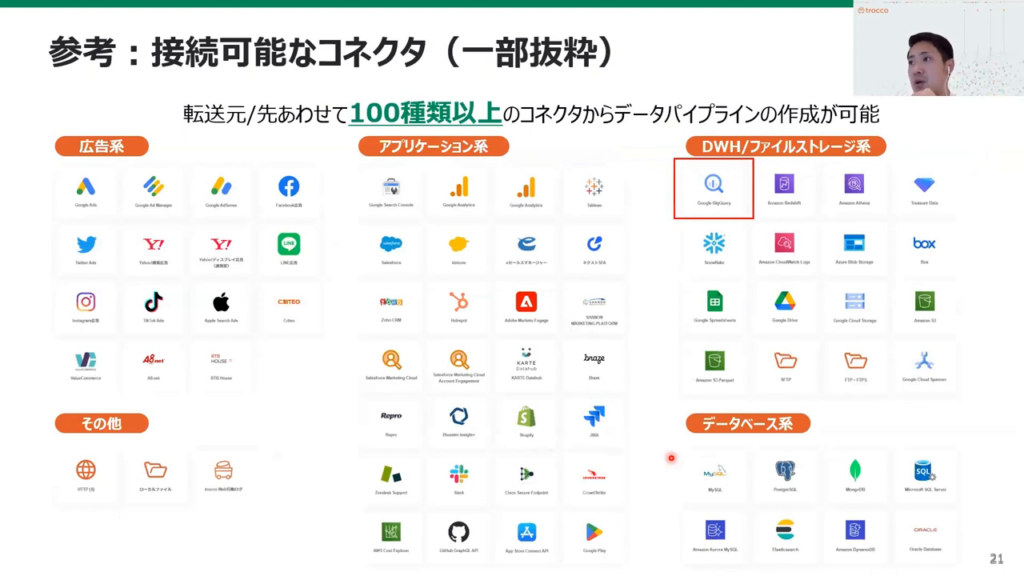 もう一つは、データ分析基盤の構築を支援するサービスで、TROCCO®というツールを活用しています。