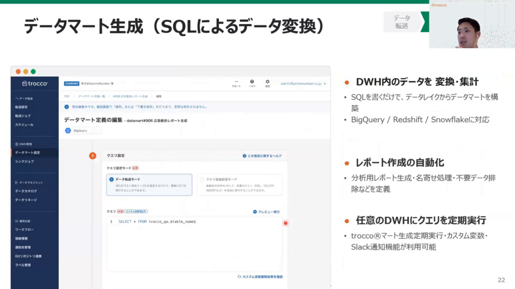 薬丸:「データマートの定義を編集するための機能や、SQLを書くだけでデータレイクからデータマートを構築する機能があります。これらはBigQueryやRedshift、Snowflakeに対応しています。