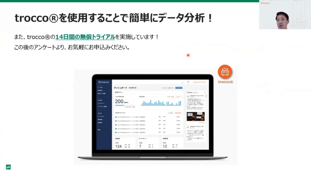 薬丸:「TROCCO®を組み込むことにより、データ分析を簡単に行うことが可能となります。現在、TROCCO®は14日間の無償トライアルを提供していますので、お申し込みいただけると幸いです。