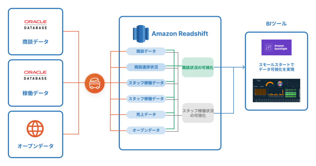 人材派遣サービスを展開する某企業は、OracleDatabaseに保存されている商談データ、稼働データ、そしてオープンデータを、TROCCO®を活用してETL(データの抽出、変換、ロード)を実行し、データをAmazon Redshiftに転送しました。Amazon Redshiftに保存されたデータをもとに、商談状況やスタッフの稼働状況がわかるようなデータを集計しました。そして、それらのデータの可視化を実現するため、BIツールとしてAmazon Quicksightを採用し、グラフなどで部署の稼働状況がわかるようにしました。
