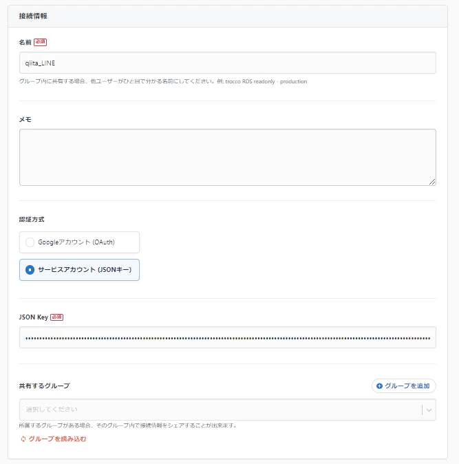 「接続情報を追加」ボタンからBigQueryの接続設定を行います。名前と、認証方式としてサービスアカウント(JSONキー)を入力します。