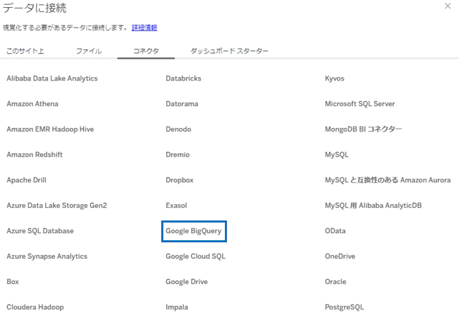 新しいワークブックを作成し、「コネクタ」タブから「Google BigQuery」を選択します。