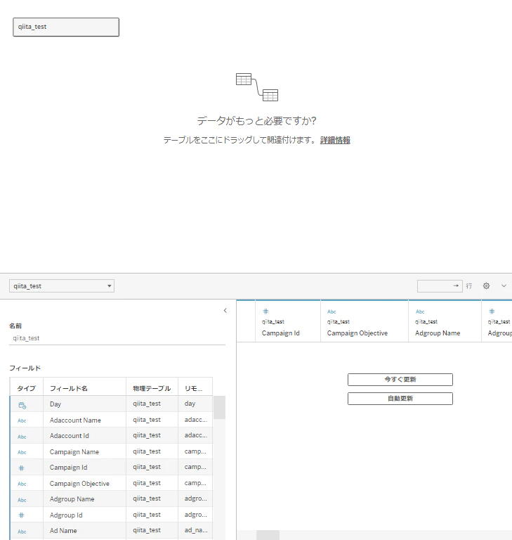 続いて、接続情報の中からデータの可視化を行いたいテーブルを選択します。