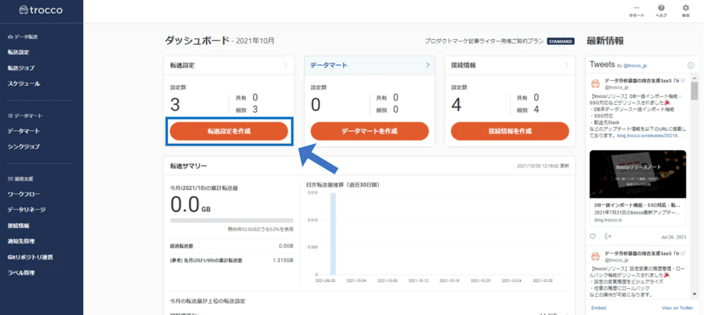 TROCCO®️にアクセスして、ダッシュボードから「転送設定を作成」のボタンを押します。