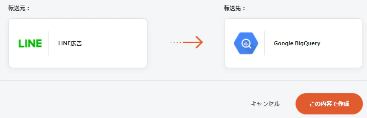 転送元に「LINE広告」を指定し、転送先に「Google BigQuery」を選択して転送設定作成ボタンを押します。
