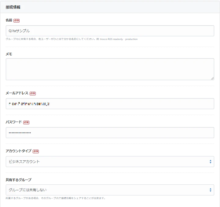 別タブで接続情報の新規作成画面が開きますので、接続情報を入力していきます。