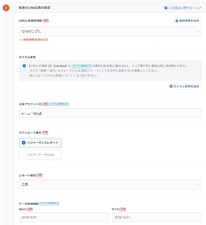 次に、取得したいLINE広告のIDやデータ取得期間を設定します。