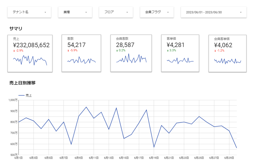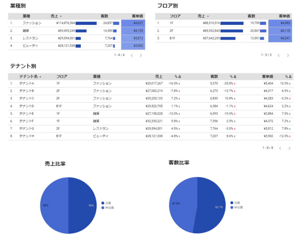 たとえば以下のダッシュボードでは、各テナントの売上の他、客数やモール会員の割合、客単価などの情報を可視化しています。