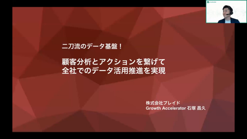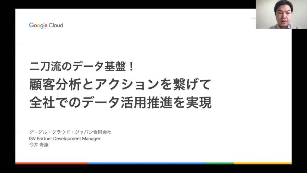 今井氏:「本日のセミナーでは二刀流データ基盤について詳しく解説します。具体的には、顧客分析とアクションをどのように繋げてデータ活用を全社的に推進するかについて説明します。」
