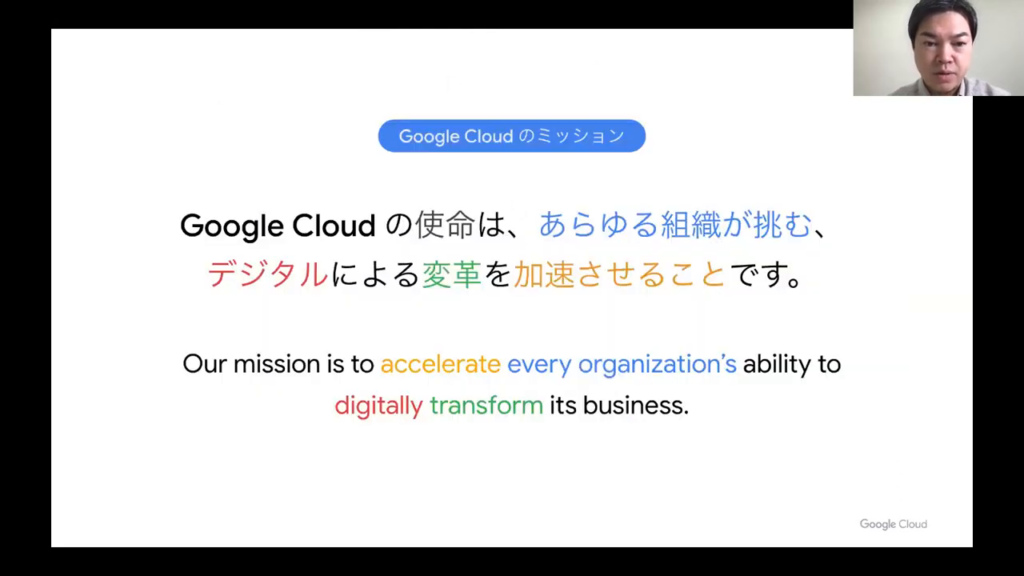 今井氏:「Google Cloudの使命は、あらゆる組織がデジタル変革に取り組む速度を加速させることです。私たちGoogle Cloudが目指すのは、企業のデジタル変革、一般的にはDX(デジタルトランスフォーメーション)の支援を行うことです。」