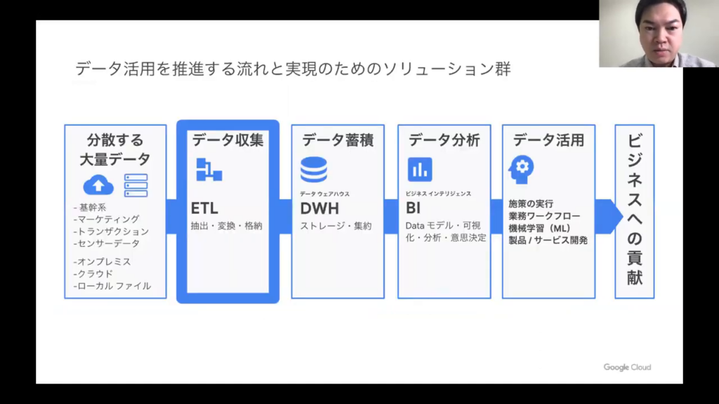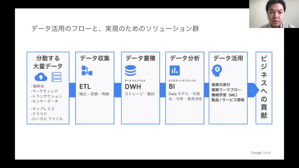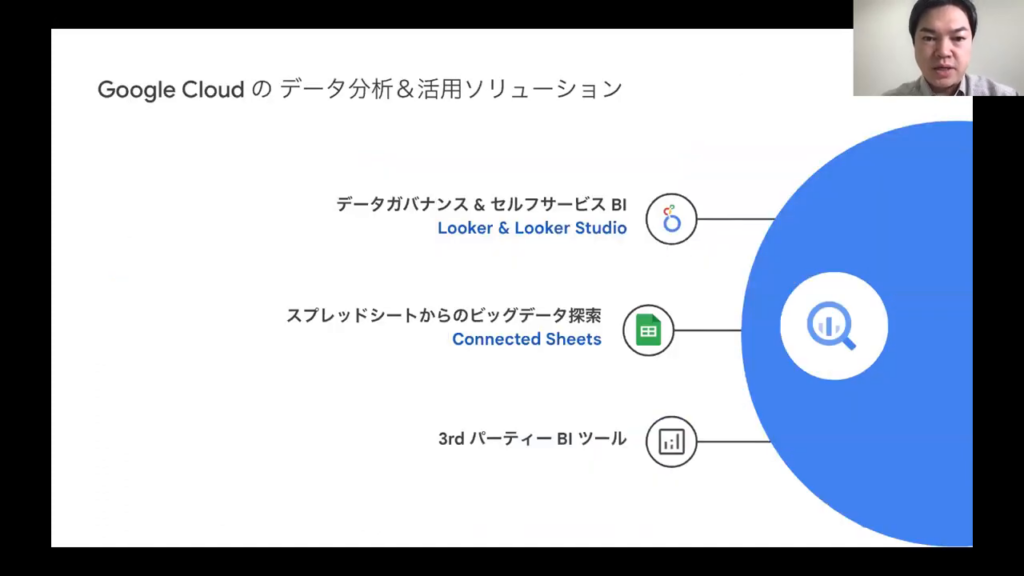 今井氏:「私たちが推奨しているGoogle Cloud のデータ分析ツールには、BigQueryという統合データベースがあります。BigQueryは、様々なBIツールからも自由に使用できます。