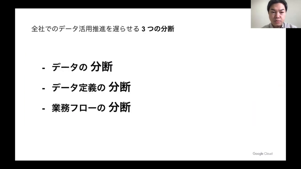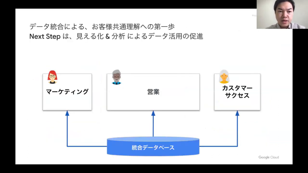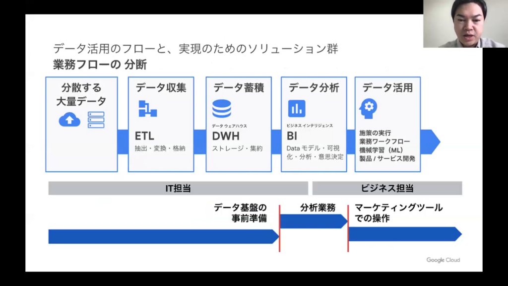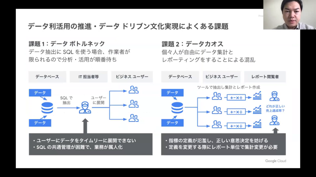 これらの分析は一般的に、BIツールなどを使ってデータを可視化し、解釈します。今日ご紹介するLookerは、これらの業務をサポートする商品です。しかし、それらを実現する前に、データの集約や蓄積といった基盤の構築が求められます。その部分が最も重要な課題となると考えています。」