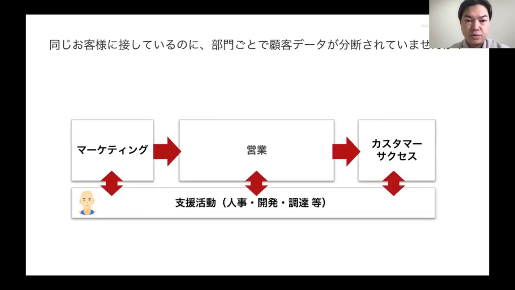 今井氏:「同じ顧客に接しているのに、部門ごとで顧客データが分断されているという問題が見受けられます。