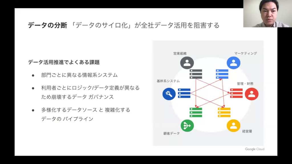 今井氏:「データの分断、いわゆる「データのサイロ化」が全社でのデータ活用を妨げる一因となっています。部門ごとに異なる情報系システムを利用しており、利用者や部門によってそれぞれロジックやデータ定義が異なるため、一貫したデータ利用やガバナンスの確立が難しい状況です。