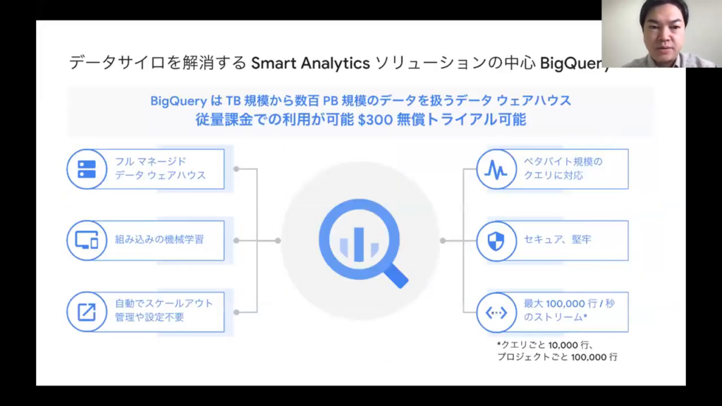今井氏:「問題解決の「Smart Analyticsソリューション」の中心に位置するのが「BigQuery」です。BigQueryは、テラバイト(TB)規模から数百ペタバイト(PB)規模の巨大なデータを取り扱うことが可能なデータウェアハウスです。しかも、その利用は従量課金型であり、最初の”$300″は無償でトライアルできます。