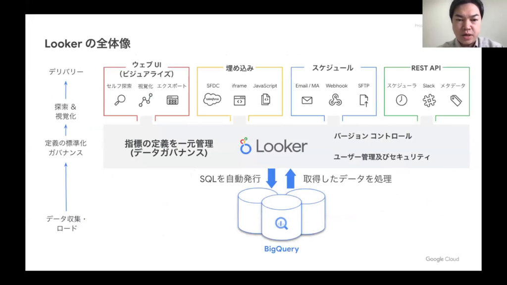 今井氏:「Lookerは、詳しい各種データを一元管理し、並行して管理を行います。主に、データウェアハウスやデータベースなどのBigQueryに接続でき、それらのデータベースに個別にSQLを集計する必要がなくなります。