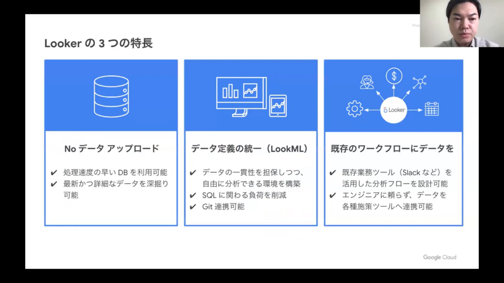 今井氏:「Lookerには、3つの主要な特長があります。