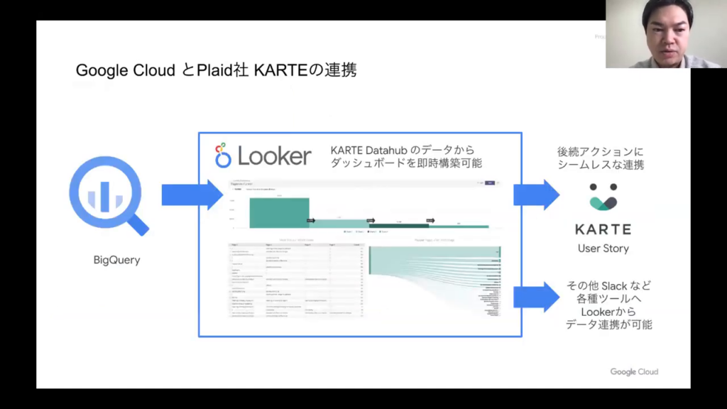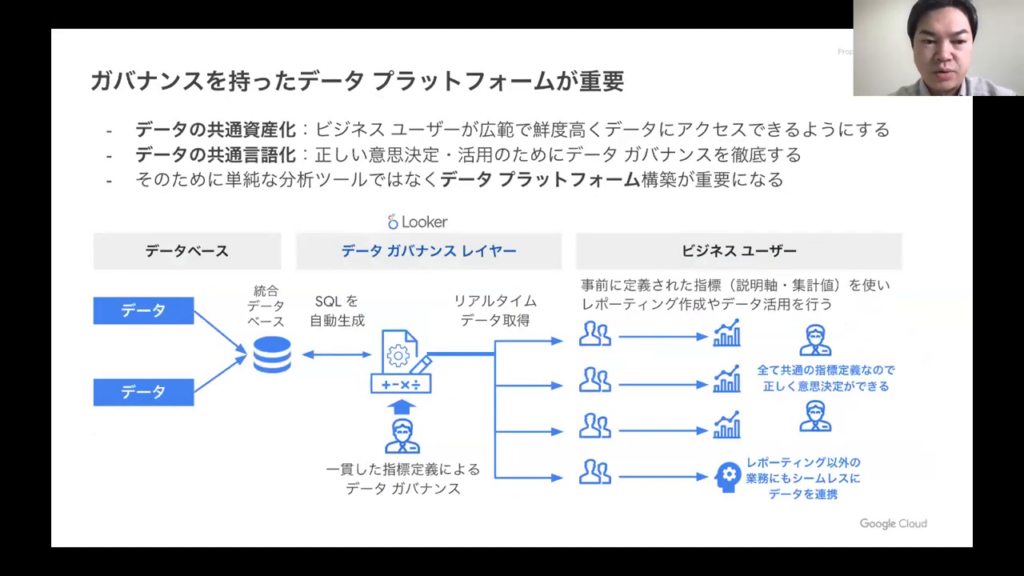 今井氏:「Lookerはデータ活用のためのプラットフォームであり、データガバナンスを管理します。ビジネスユーザーは、必要なタイミング、場所でデータの取得が可能です。これにより、データの可視化に留まらず、各種ツールへの連携も行い、データを次のアクションに繋げていくことができます。